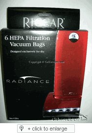 Riccar Radiance HEPA Vacuum Cleaner Type X Bags fits Radiance models RADP and RAD. Riccar performance HEPA bags are uniquely designed to provide maximum airflow, required fro deep cleaning, and high efficiency filtration to capture 99.97 percent of airborne allergens. Same as part C20-6. Genuine 6 pack of Riccar HEPA performance vacuum bags.
